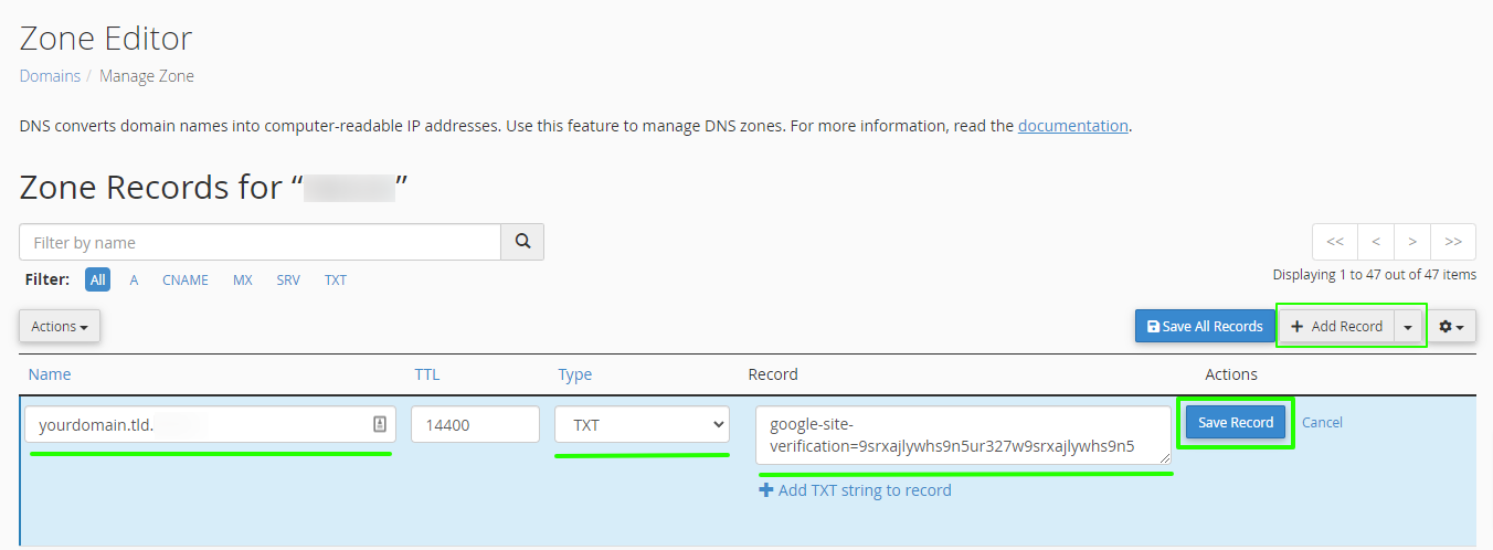 | **Record / TXT Value** | google-site-verification=xxxxxx |